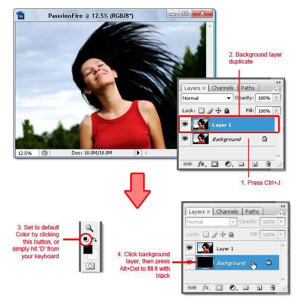 Dengan aktif "PassionFire" gambar, menduplikasi "background" layer. Set latar depan dan warna latar belakang hitam dan putih dengan menekan D di keyboard. Klik "background" layer lagi dan mengisinya dengan warna foreground ~ yang diatur ke hitam. Lihat gambar di bawah.
